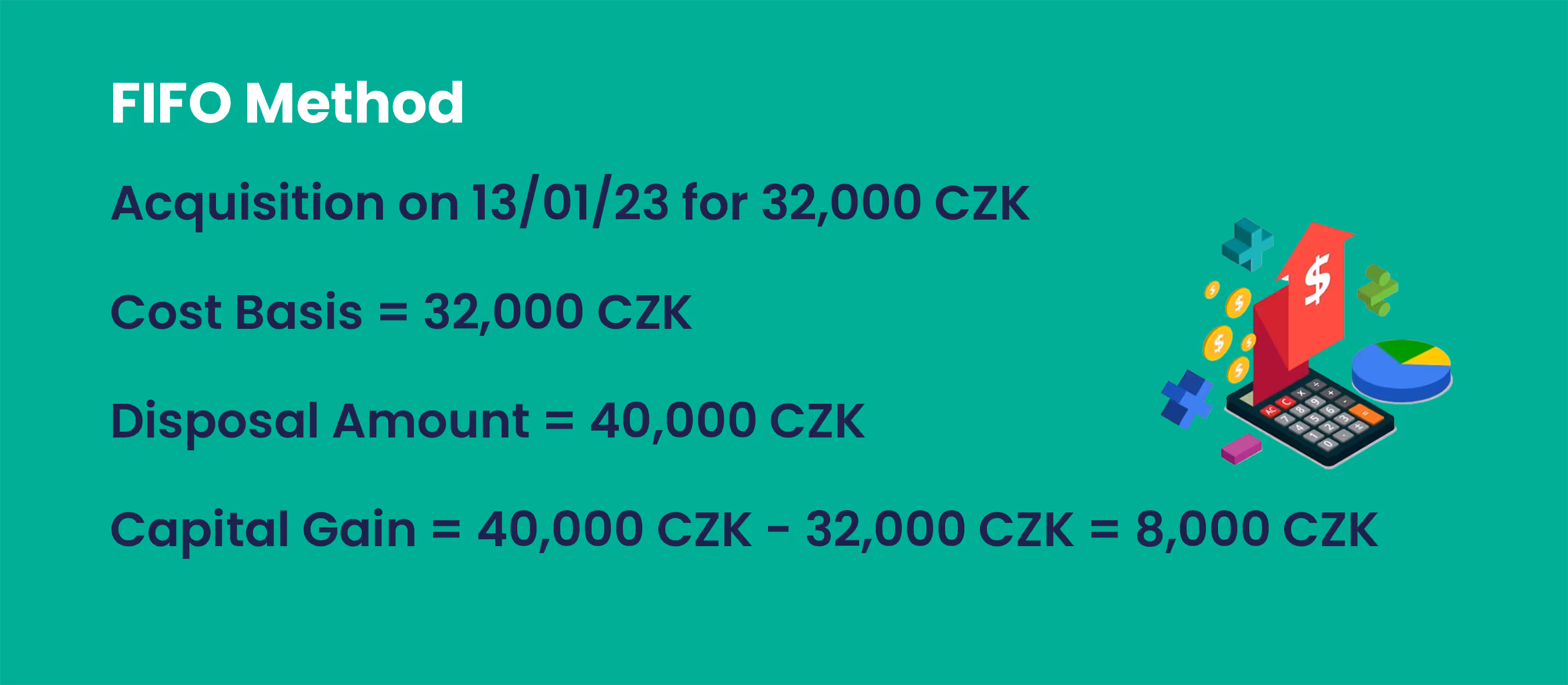 While the Czech Republic does not impose a capital gains tax, calculating gains for tax purposes remains essential. Two accepted accounting methods for determining the cost basis in the Czech Republic are the FIFO (First-In-First-Out) method and the Weighted Arithmetic Average Method.