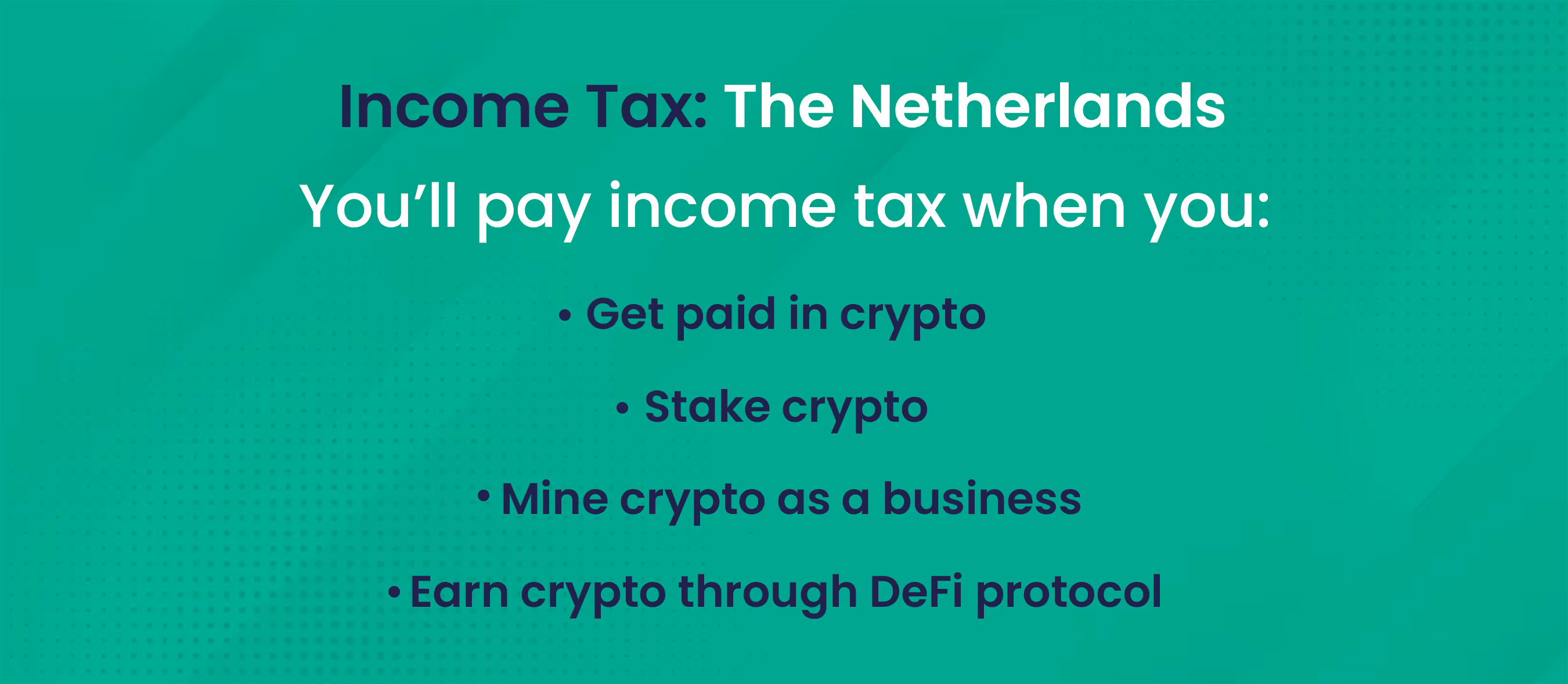 Crypto is taxed as income for employment (Box 1) in the Netherlands when you receive crypto as a salary, earn staking rewards, participate in liquidity pools, mine tokens as a business, or earn DeFi interest.