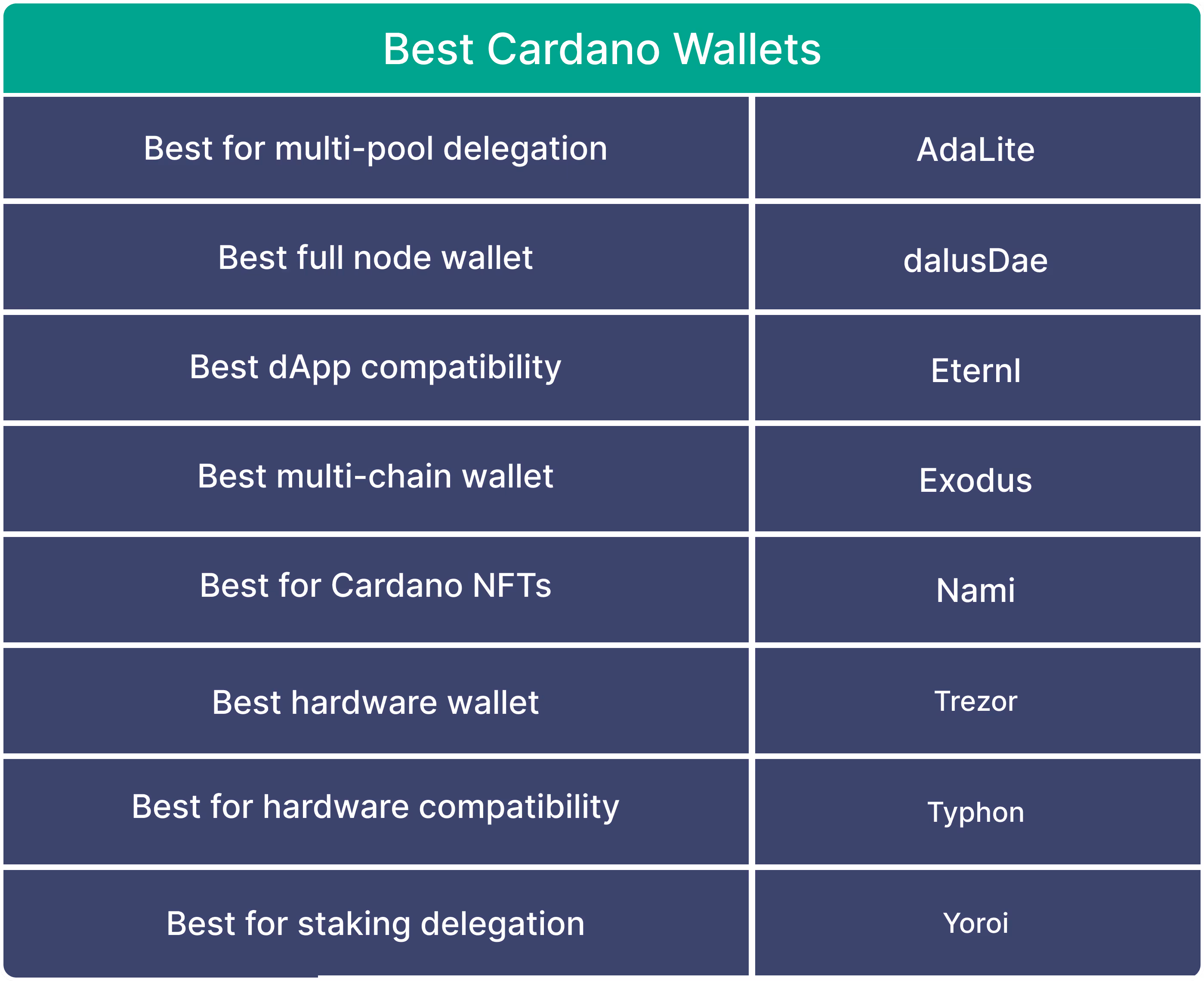 In terms of the best wallet for staking Cardano, our list includes wallets suitable for staking Cardano, with Daedalus being the top choice for a full node wallet, while Yoroi is the most popular light wallet based on downloads.