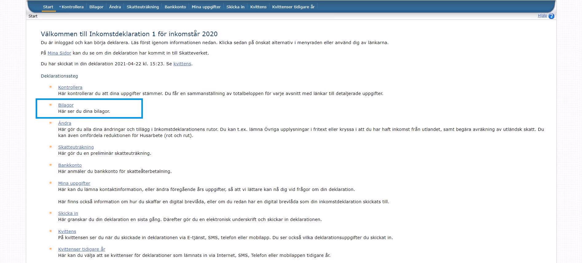 När du är inne på "Inkomstdeklaration 1" ska du välja "Bilagor"