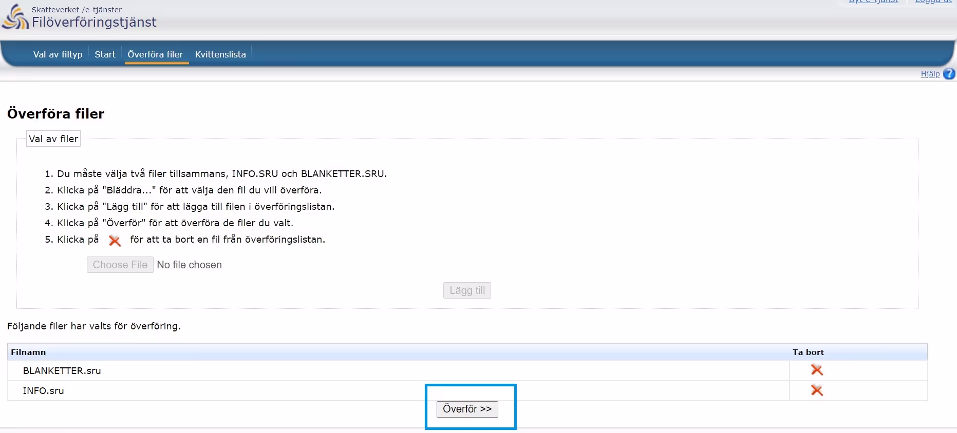Vid filöverföring av SRU-filer till Skatteverket är det de två följande filerna som ska överföras: BLANKETTER.SRU, INFO.SRU